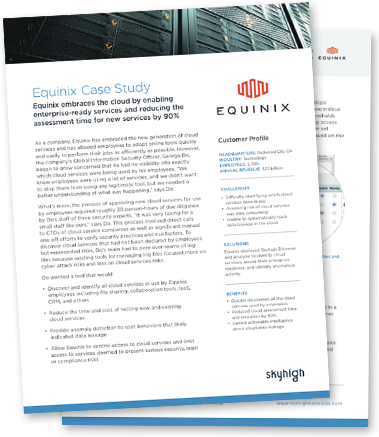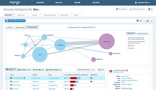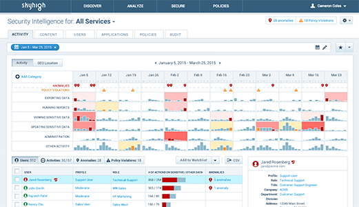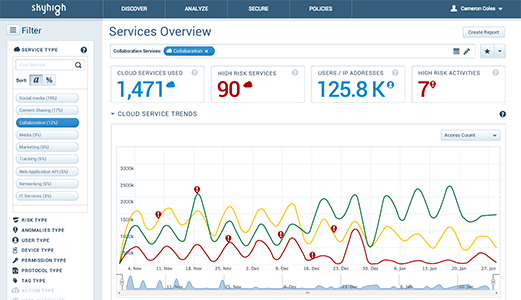 Skyhigh is a cloud access security broker (CASB) that helps organizations address both sides of the cloud data security challenge – shadow IT and sanctioned IT. Using Skyhigh, organizations get detailed cloud analytics to discover all cloud services in use including SaaS, PaaS, and IaaS. Skyhigh summarizes cloud usage, revealing which cloud services are in greatest demand by employees so IT can invest in those categories to support innovation and growth in the business. The solution provides an objective risk assessment for all cloud services, identifies anomalies indicative of data exfiltration, and quantifies overall risk to benchmark with peers.
